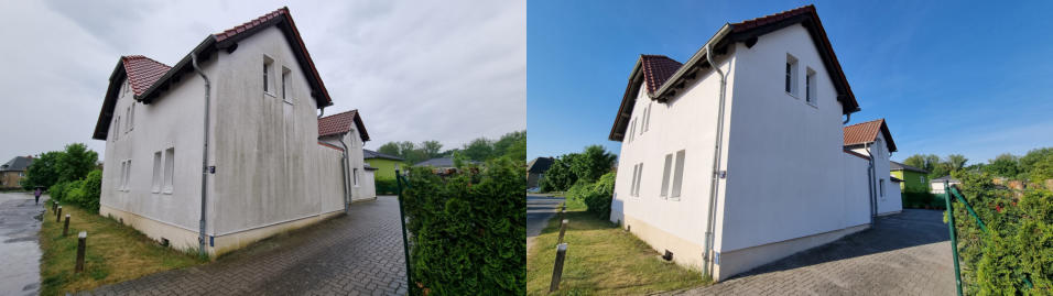 Mit unseren Teleskoplanzen reinigen wir problemlos Häuserfassaden bis zu 10 m Höhe. So auch bei diesem Objekt, dessen Fassade